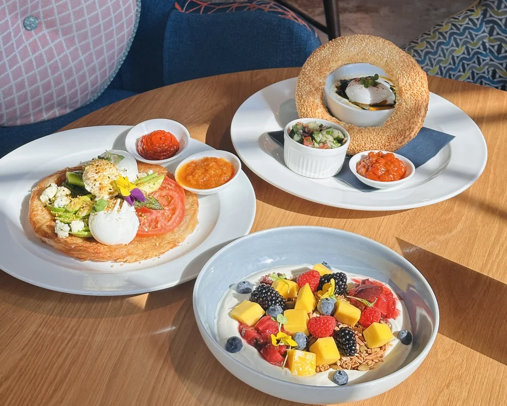 Then there are flavours that feel bold yet homely. The Turkish brings together poached eggs baked with garlicky yoghurt and baby spinach, finished with paprika oil and ajvar for gentle heat and depth. Served with a chopped salad and simit bagel, it’s aromatic, comforting, and quietly indulgent.