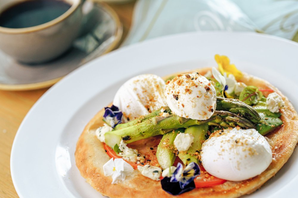 Flinders Lane offers a heartier kind of comfort. Crisp mallawach filo forms the base for layers of creamy labne, ripe avocado, grilled asparagus, and softly poached eggs, finished with tomato, sesame seed and nut dukkah, harissa, and tomato kasundi. A dish full of texture and warmth, designed for lingering.