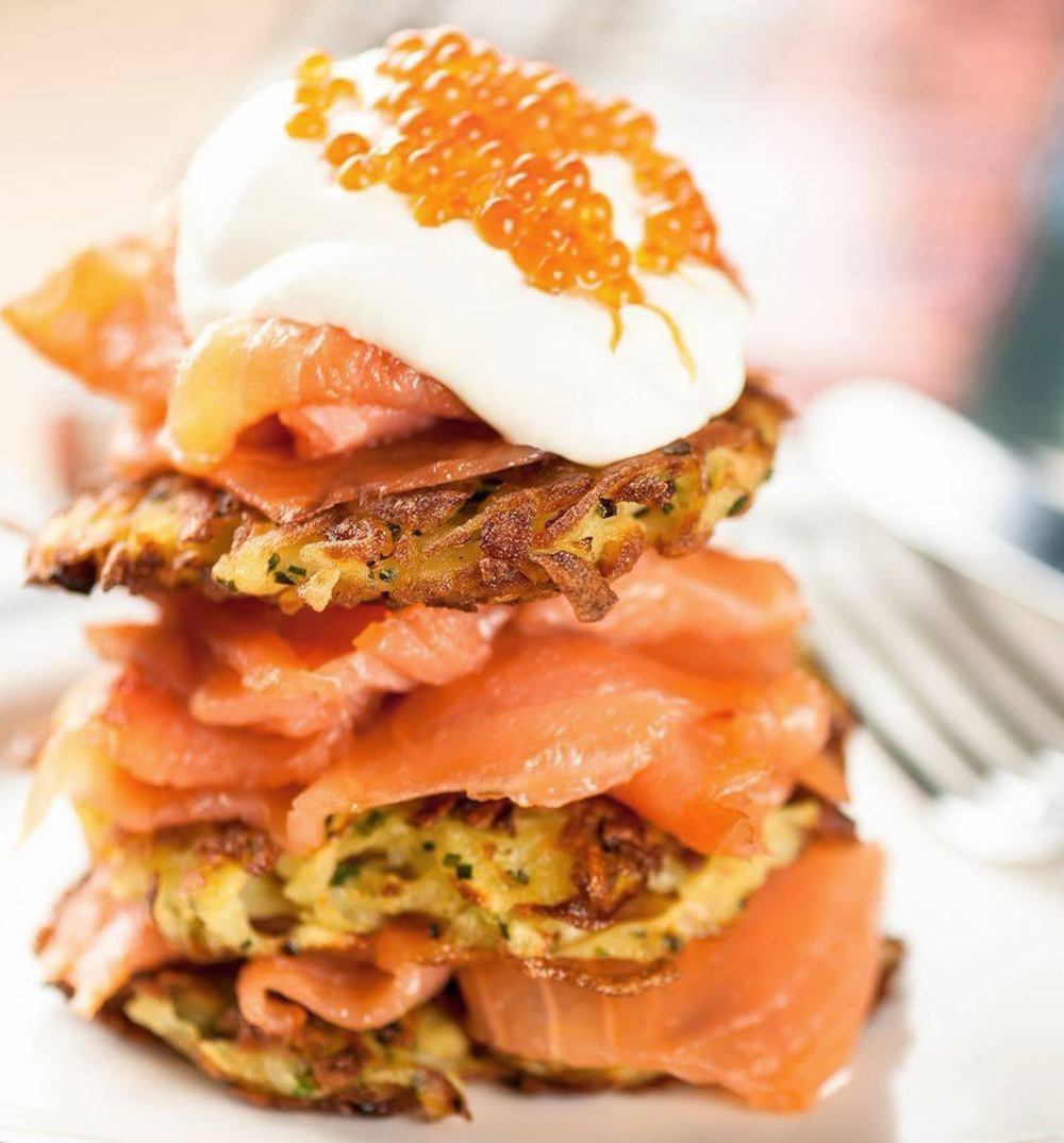 Crispy potato fritters with smoked ocean trout, creme fraîche and salmon pearls